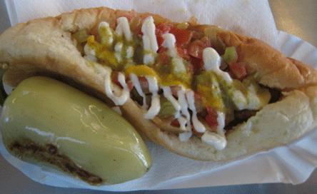 The menu includes several variations on the simple taco: carne asada, pollo, pastor, frijole, cabeza, borrego, fish and taco. As you place your order, take a gander at the kitchen where a number of industrious people are engaged in the behind the scenes action that often goes unappreciated: chopping meat, grating cheese, flipping tortillas on the comal, preparing salsa. Place your order and in a manner of minutes you’ll be called to a stainless steel cart to pick up your hot dogs.