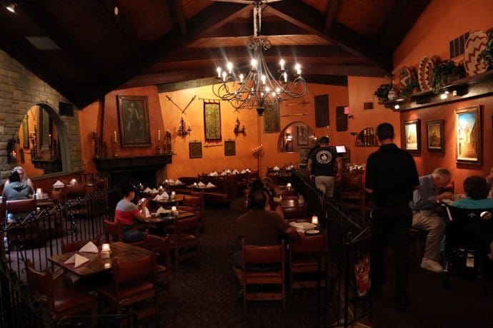The dining room at Cervantes is in two levels with a lower center section flanked on both sides by seating for lesser numbers. Tables in the lower center section accommodate larger parties. The ambience is a sort of Spanish Gothic meets Mexican traditional. Chandeliers suspended from the ceiling provide low-light comfort that just seems appropriate considering the dark woods and especially the crossed Spanish swords and shields festooning the walls on either side of the fireplace where el Duque de Alburquerque appears to look over the restaurant. Colorful Mexican blankets are strewn about judiciously.