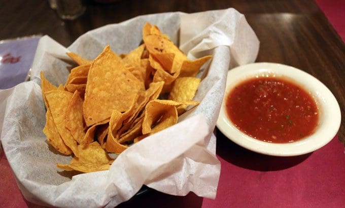 A basket of chips and a bowl of salsa are presented with your menu. The first round is complementary, the second (and likely third and forth) will cost you a pittance. The chips are unsalted, but large and crisp, perfect for Gil-size scoops of salsa. The salsa is gloriously red, constructed of fresh ingredients (garlic, tomatoes, onion and I believe both jalapeno and green chile). It is of medium piquancy with just enough bite to get your attention.