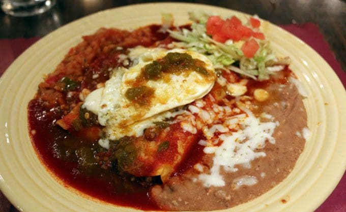 17 July 2016: Another long-time Cervantes favorite is the enchilada plate, a plate of New Mexico enchantment comprised of your choice of two or three rolled enchiladas–two stuffed with cheese and one with ground beef. You can also have them stuffed with carne adovada or chicken. The enchiladas are great with both green and red chile and with a fried egg on top, but for my money, the red chile accentuates the other ingredients best. As with other plates, the enchiladas are served with refried beans and Spanish rice. Skip the Spanish rice and ask for two portions of the beans. They’re among the best in town.