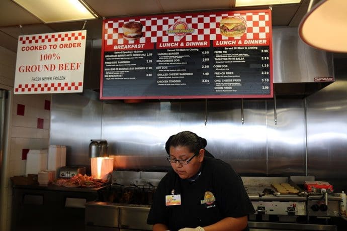 The Laguna Burger is simply one of the very best green chile cheeseburgers in New Mexico! Cooked to order from 100 percent, never frozen ground beef (an 80/20 blend), it is a half-pound of pure deliciousness. Today, there are three Homes of the Laguna Burger, the most recent addition strategically positioned directly across I40 from the Route 66 Casino. Interestingly, it has an Albuquerque address (14311 Central Avenue). As with its siblings, it is located within the confines of a superette. Walk past the checkout counters and their temptations and you’ll find a diner-like space dedicated to the Laguna burger and several other menu items.