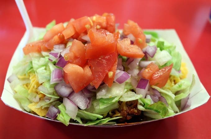 The Laguna Burger has a surprisingly large menu for operating in such a small space. The menu includes foot long hot dogs and chili cheese dogs, corn dogs, grilled cheese sandwiches (on Texas toast), Frito pies, chicken tenders, onion rings, taquitos with salsa and more, but it would be very hard to pass up the Laguna Burger.