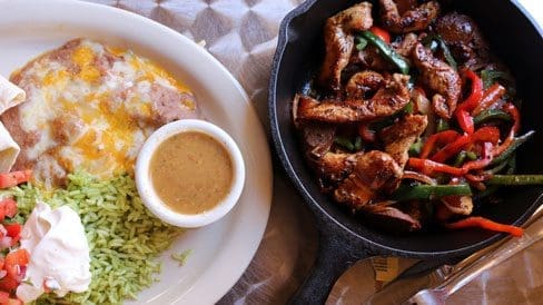 15 August 2015: Shrimp are also available on the “fiery skillet” entrée which by any name would still be fajitas. Landlubbers can opt instead for chicken and chorizo served with Alicia’s tortillas, fresh peppers, Mexican crema, pico de gallo and a fresh Ranchero sauce with refried beans and green rice on the side. As fajitas go, these are quite good. My Kim especially appreciated that the green and red peppers are sliced into thin strips and grilled to an optimum level, neither al dente nor mushy. The flavors of the chicken and chorizo go very well together. My favorite item on this entrée were the refried beans topped with melted yellow and white Cheddar.