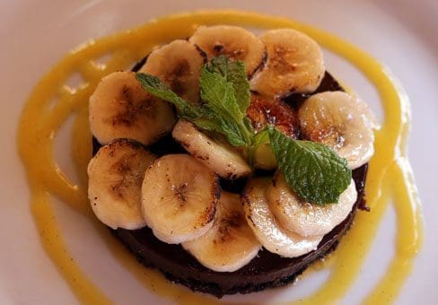 15 August 2015: My preferred desserts lean toward strong flavor profiles, not desserts with cloying tendencies. It’s one of the rare disagreements my Kim and I have. For me, the stronger and darker the chocolate the greater the appeal; for her, it’s milk chocolate or it’s too strong. She didn’t like the Cantina’s Banana Chocolate tart, a semi-sweet chocolate tart topped with caramelized onions and encircled by a tangy citrusy swathe. There’s a lot going on with this dessert, highlighted by the strong chocolate.