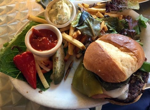 15 August 2015: If a green chile cheeseburger includes chile, but it isn’t New Mexico green chile grown in the Land of Enchantment, can it still be called a green chile cheeseburger? Apparently not because the Cantina’s sole burger offering features not the pride of New Mexico, but pickled Fresno chile which is grown throughout California. It’s called “The Cantina Gold Canyon Beef Burger” and it’s an “everything but the kitchen sink” burger. In addition to the pickled Fresno chile (in strips), this behemoth includes sharp Cheddar cheese, sliced smoked ham, crispy fried Vidalia onion, greens, tomato and cilantro mayonnaise and pickles with boardwalk fries and Habanero ketchup on the side. To take this burger to another level, you’ve got to smear the Habanero ketchup on heavily. It’s perhaps the tastiest element of a burger replete with ingredients.