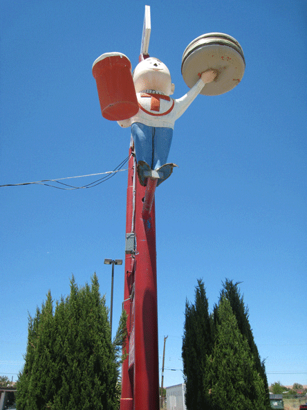 The restaurant’s real treasures are indoors where nostalgia abounds in the form of vintage art and period signage festooning the walls. You’ll want to stroll up and down the aisles and study the collection Gil Tabet amassed over the years. A collection of framed photos back-lit by small LED (light emitting diode) lights is well worth checking out. My favorite is one of Central Avenue (Route 66) in the Duke City looking east near the intersection of Carlisle. It’s amusing to see all that’s changed since the photo was taken, probably in the late 1960s, and what remains the same in our beloved Land of Mañana.