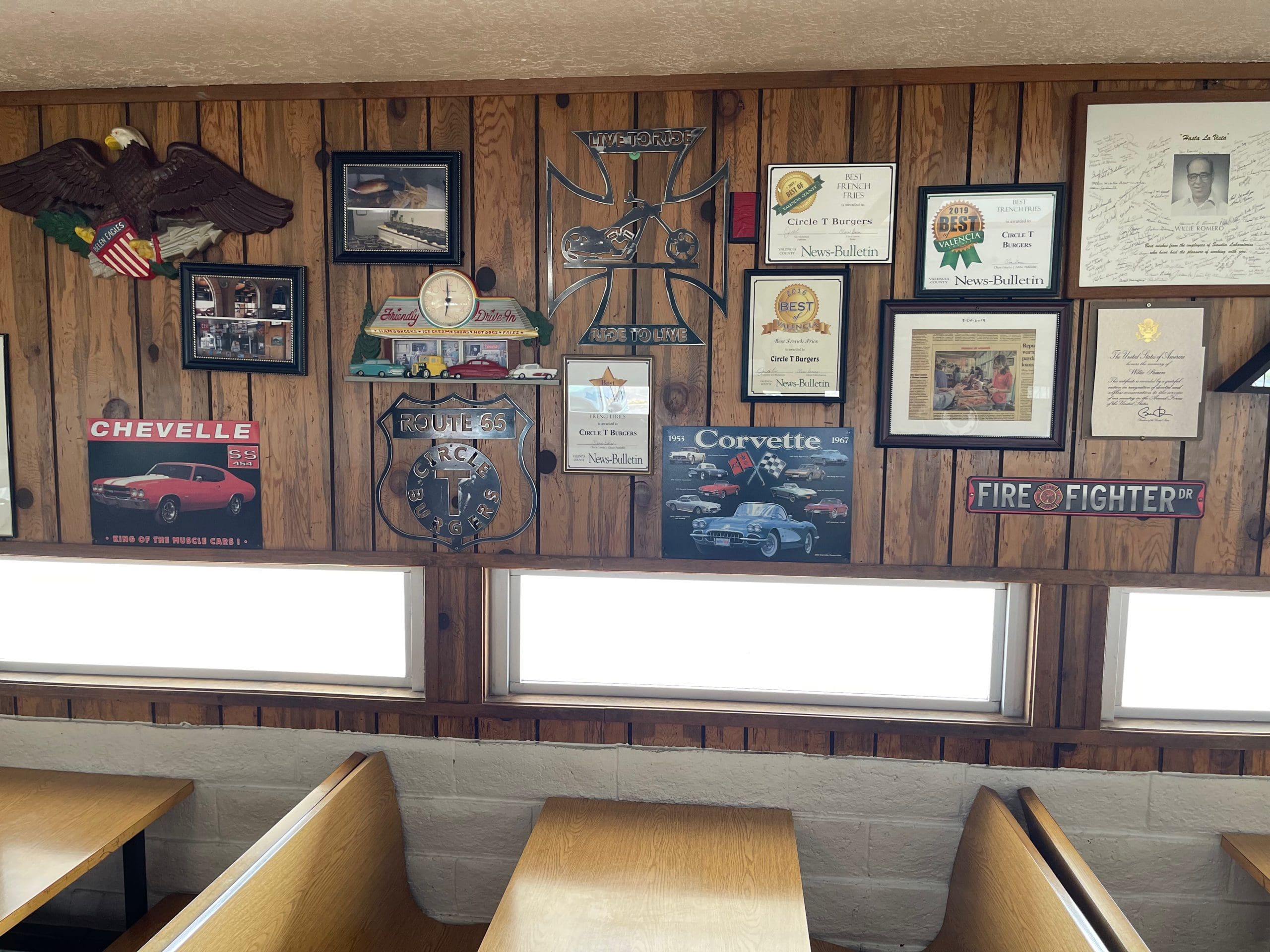 The Circle T on Belen’s Main Street has the look and feel of the 50s-style restaurant it is. In years gone by, when you approached the restaurant from the north, you would espy a 1960s icon for A&W’s teen burger, a fiberglass statue of a teenager sporting a letterman’s sweater emblazoned with an encircled letter T. The teenager is holding a frosted mug on one hand and a gigantic burger on the other. The years were not kind to that statue which is now just a memory. A large sign confirms you are indeed at Circle T Burgers. A large enclosed patio faces Main Street while an old-fashioned pick-up counter can be found on the restaurant’s southern parking lot, ostensibly for calling in your order in advance and picking it up quickly.