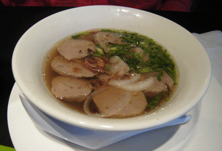 22 August 2010: As Bourdain fans know, he considers pho, a wonderful Vietnamese noodle soup, his favorite comfort food, claiming that he would “jerk a butter knife across his best friend’s throat” for a bowl of pho. Fortunately the portion size for pho at most restaurants is about the size of a small swimming pool, so a bowl of pho is usually large enough for two to share. If you’re not hungry enough for a large bowl, the appetizer menu comes to the rescue with two small portioned soups–a meat ball soup and a wonton soup.