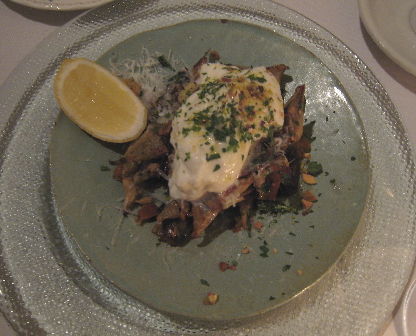 The baby artichokes are roasted to a delicious crispiness then blanketed with a large “dollop” of burrata. The combination is an adventure in textural appreciation–from the coarse yet delicate artichokes to the unique textures (exterior and interior) of the creamy burrata. This is a fabulous appetizer you have to experience to truly appreciate.