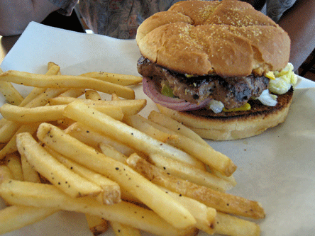 My buddy Bill “Roastmaster” Resnik had a cheeseburger which he praised for its hand-formed, fresh beef patty though the overly toasted bun detracted from his overall enjoyment. The beef patty appears to be about six ounces. It is joined on sesame seed buns by red onion, crisp lettuce, tomatoes, pickles, mustard and mayo. French fries seasoned with salt and pepper are also available as a side.