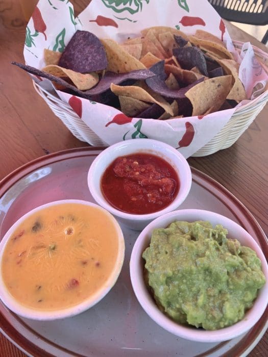 The salsa and chips are outstanding. The salsa features lush red tomatoes redolent with pungent green chile and a liberal application of cilantro. It has a slightly sweet aftertaste. You’ll run out of salsa before you run out of the warm blue and yellow corn tortilla chips. The chips are relatively thin, but are unfailingly crisp, low in salt and are formidable enough to scoop up Gil-sized portions of salsa. As great as the salsa is, don’t limit yourself to just salsa. Order the trio: salsa, guacamole and chile con queso. All three are exemplars of New Mexico’s favorite appetizers.