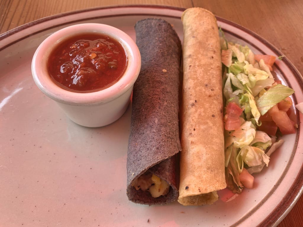 19 June 2020: In 2007, Science Daily revealed that blue corn tortillas are healthier than their white counterparts, especially for dieters and diabetics. Scientists discovered that blue corn tortillas had less starch and a lower glycemic index than white tortillas. New Mexicans probably don’t think about this as they’re enjoying the sweeter, nuttier flavor of beautiful blue tortillas, especially when those tortillas serve as a canvas for enchiladas topped by red and green chile and an egg fried over easy. As with all entrees at La Choza, the blue corn enchiladas are served hot, almost steaming. It’s a nice touch.