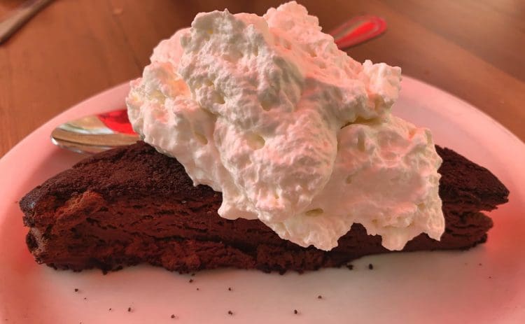 19 June 2020: La Choza’s dessert menu–and you’ve got to order dessert even after you consume sopaipillas with real honey–doesn’t include some favorites from The Shed. Absent from the menu is the lemon soufflé which Food Network celebrity Rachael Ray called “divine and delicate.” Rather than bemoaning what is left off the dessert menu, celebrate the wonderful options remaining–such as homemade French apple pie topped with a profusion of chopped walnuts, cheesecake (a creamy filling on Zwieback crust with a sour cream vanilla topping), hot fudge sundae (yum, dark chocolate on rich vanilla ice cream), red raspberry sundae (fresh frozen raspberries on rich vanilla ice cream) and perhaps the best of all, the Mocha Cake.