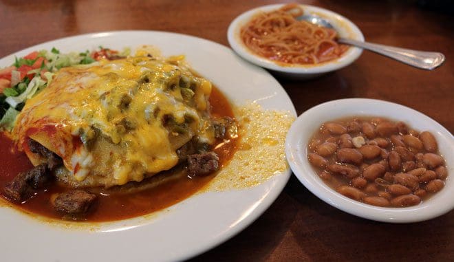 The sopaipillas will have that “corazon contento” effect on you, too. Not quite the size of a deflated football, they’re the perfect way to end a great meal. Best of all, these golden treats are served with real clover honey, not that inferior honey-flavored syrup far too many restaurants use. Clover honey is honey that has been harvested from bees that have gathered nectar mostly from clover. It’s not overly sweet, but this golden-hued ambrosia is just sweet enough for some of the very best sopaipillas in the Duke City.