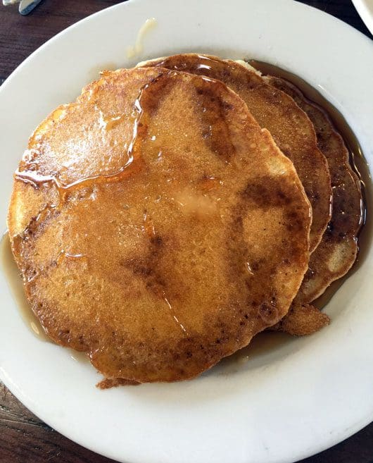 10 April 2018: As Evelyn’s Homemade Pancakes (a full stack of fluffy, delectable pancakes served with butter and syrup on the side) approached our table, we caught a faint whiff of vanilla. To our minds, vanilla is wholly unnecessary and makes an already sweet dish nearly cloying. That’s too bad because the three golden orbs are light, fluffy and beautiful. Rather than vanilla, my preference would have been pancakes in which either cheese or bacon was embedded.