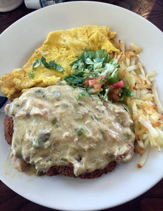 10 April 2018: In her wonderful tome Sandwiches That You Will Like, my dear friend Becky Mercuri explains that Route 66 in Texas was often called the Chicken Fried Steak Highway. With her usual poetic flair, she elaborated: “As splendid and noble as barbecue and Tex-Mex are, both pale before that Great God of Beef dish, chicken-fried steak.” As regular readers of this blog know, my friend Bruce “Sr Plata” frequently worships at altars where that Great God of Beef is prepared. In the past several years, we’ve explored the highways and byways around the Duke City in search of the best chicken fried steak to be found.